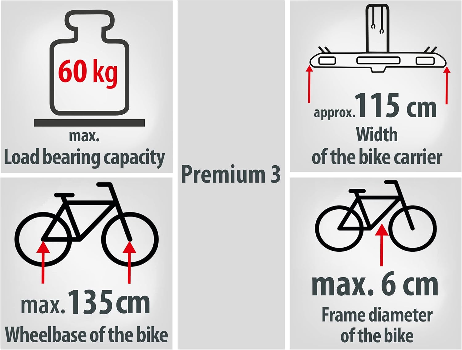 Le Premium III est compatible avec la plupart des véhicules équipés d’une boule d’attelage : berlines, breaks, SUV, monospaces et utilitaires compacts. Il convient de vérifier la charge verticale maximale (charge S) autorisée par l’attelage du véhicule avant utilisation.